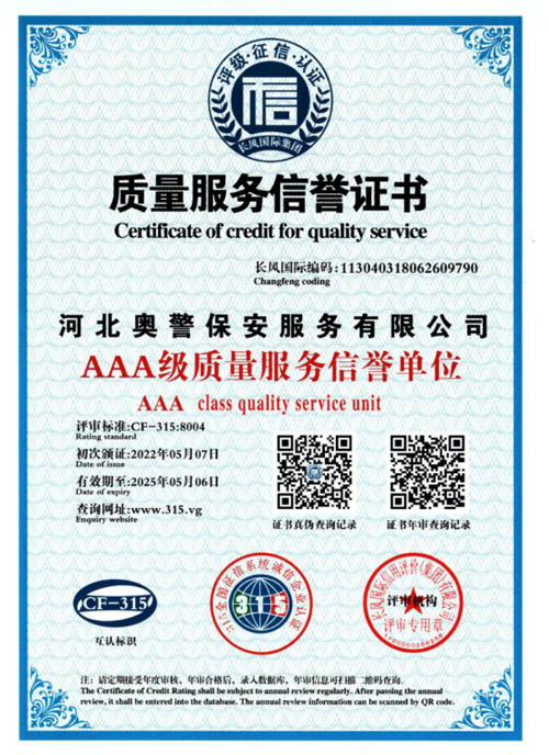 河北奧警保安服務有限公司河北奧警保安服務有限公司成立于2017年7月20日,注冊資金1000萬元,具有中華人民共和國《保安服務許可證》(編號:冀公保服20180085)的綜合性安保企業。